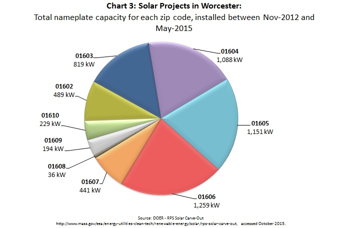 As of May 2015, the Worcester community now has 390 solar projects with a total capacity of 5.7 MW (5,706 kW).